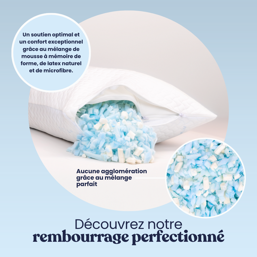 Nous avons entièrement repensé l'oreiller à mémoire de forme classique pour donner naissance à une pièce d'excellence. Son secret ? Un garnissage totalement modulable, né d'une alliance parfaite de mousse à mémoire de forme, de latex naturel et de microfibres ultra-douces.