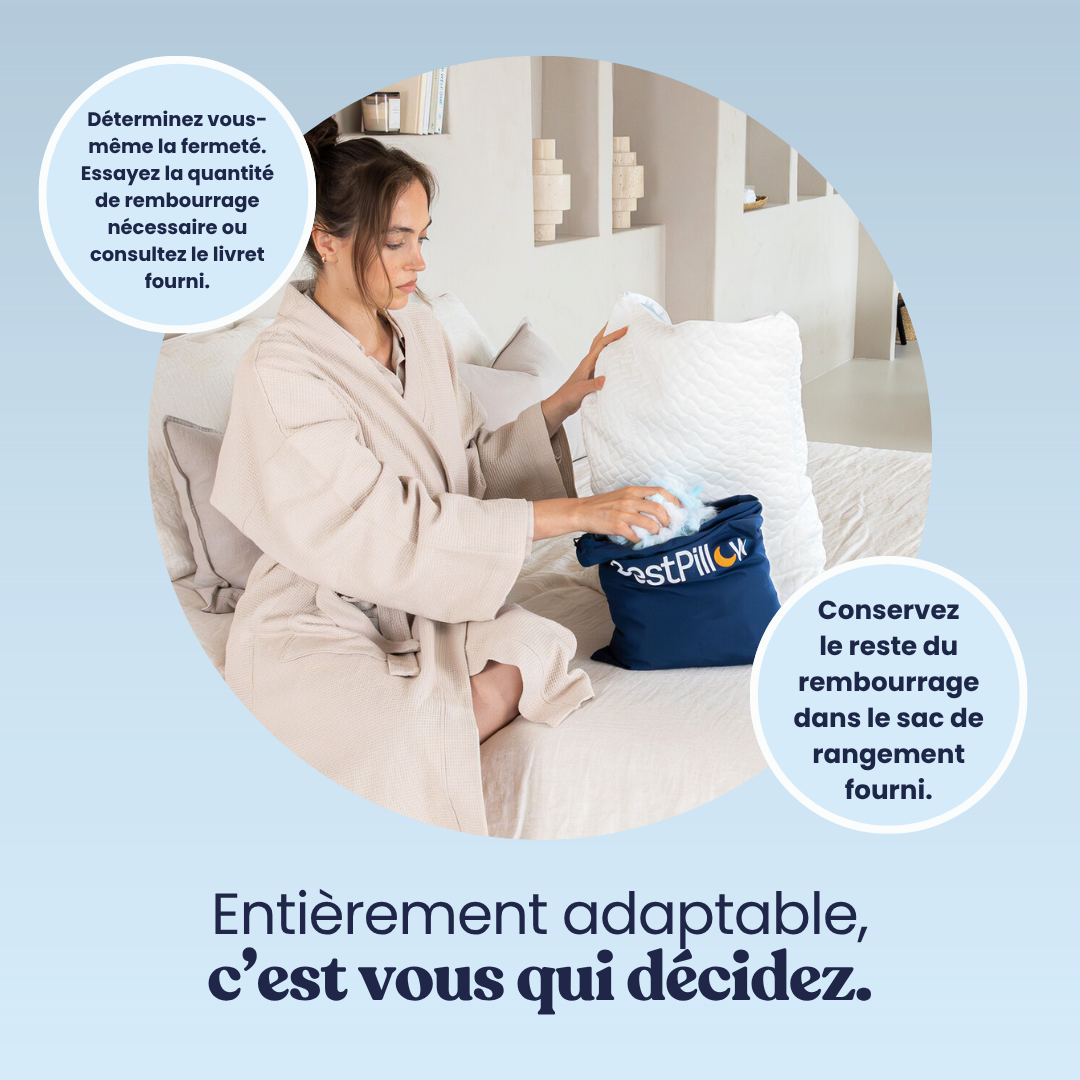 Que vous dormiez sur le dos, sur le côté ou sur le ventre, BestPillow s'adapte à vous afin de vous offrir le soutien idéal. Grâce à son garnissage ajustable, vous avez enfin le pouvoir de créer l'oreiller parfait qui vous convient. Rangez simplement le garnissage excédentaire dans la pochette premium fournie pour pouvoir facilement ajuster ou remplacer votre oreiller ultérieurement.