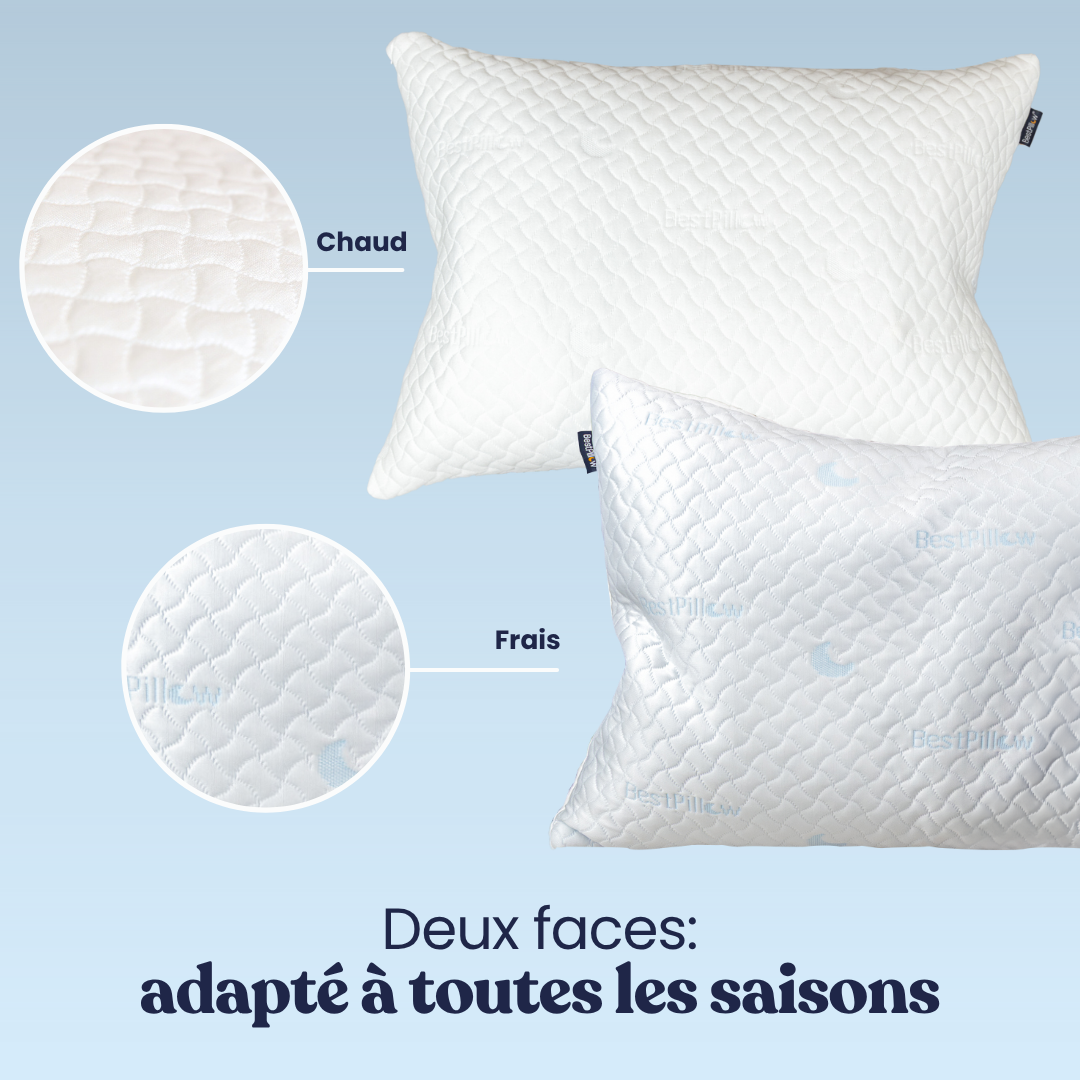 Le BestPillow propose une innovation exclusive grâce à sa conception double face. D’un côté, une face rafraîchissante pour les nuits d’été, tandis que de l’autre, une face douce en bambou vous enveloppe de confort. Cette alliance unique vous permet de profiter d'un sommeil naturel et d'un confort thermique optimal. C’est l’oreiller idéal, parfaitement adapté aux besoins de votre corps tout au long de l'année.